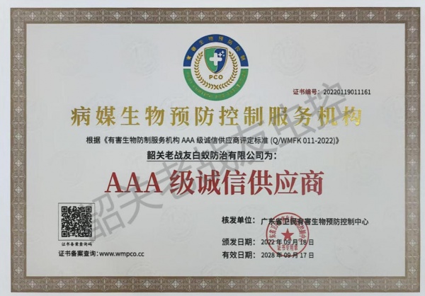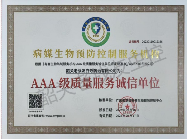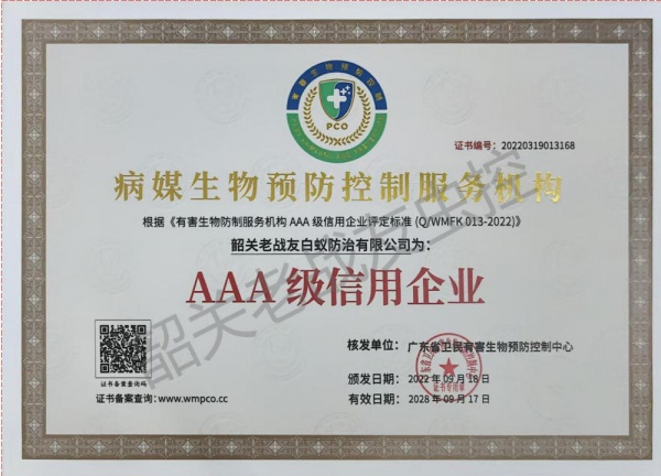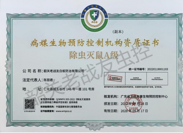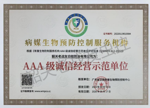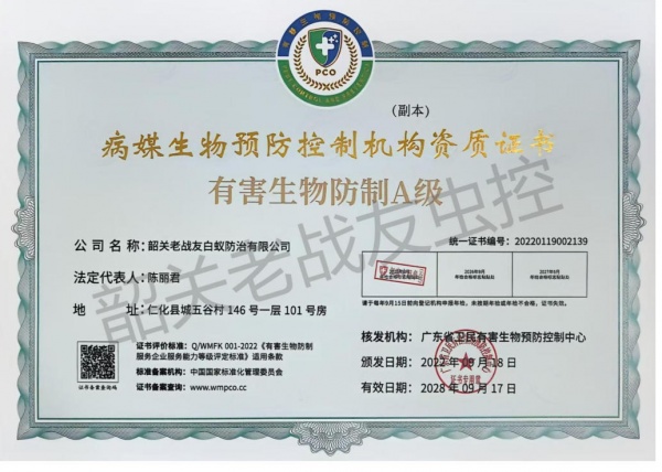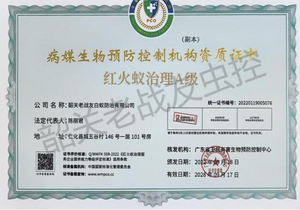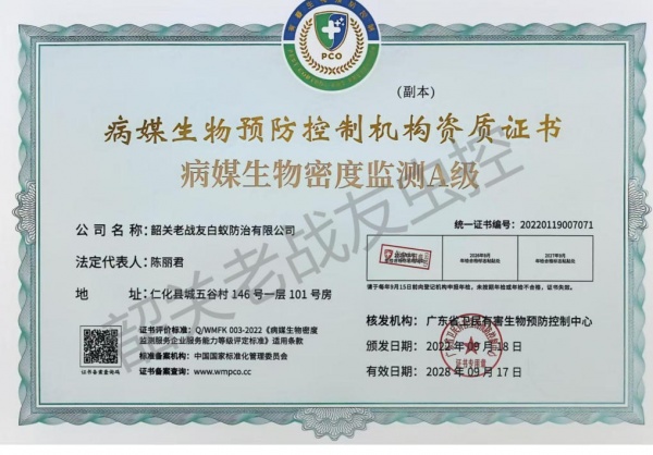 韶关老战友白蚁防治有限公司主要是由原武警韶关市支队退伍老兵黄明志,程怀锋共同组建:主要承接白蚁防治、四害消杀(蚊,蝇,鼠,蟑,)红火蚁防治,农业,林业各种病虫害防治,及韶关市范围小区家庭消杀服务,每户每年只需9元,服务12次是经工商管理局批准注册成立。公司针对工厂、宾馆、酒楼、银行、商场、邮局、家庭、公寓、别墅、学校、**院、写字楼、公园、花园小区、社区、图书馆、娱乐场所、夜总会、休闲中心、船舱等场所的消杀服务。本公司是韶关市白蚁行业协会会长单位,且负责人程先生担任韶关市白蚁行业协会会长,韶关老战友白蚁防治有限公司一直致力于先进