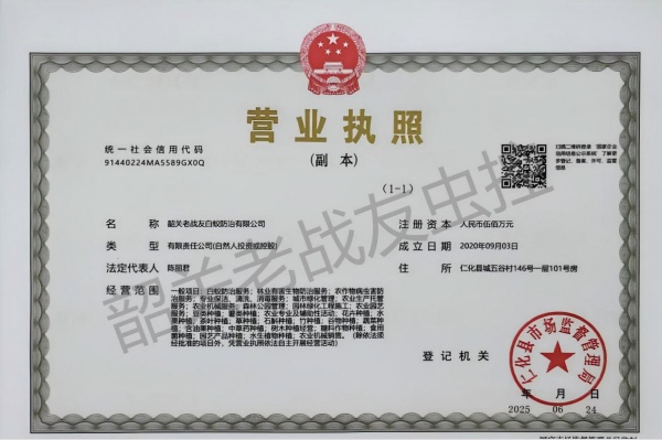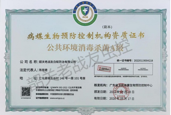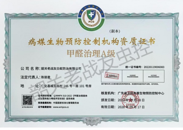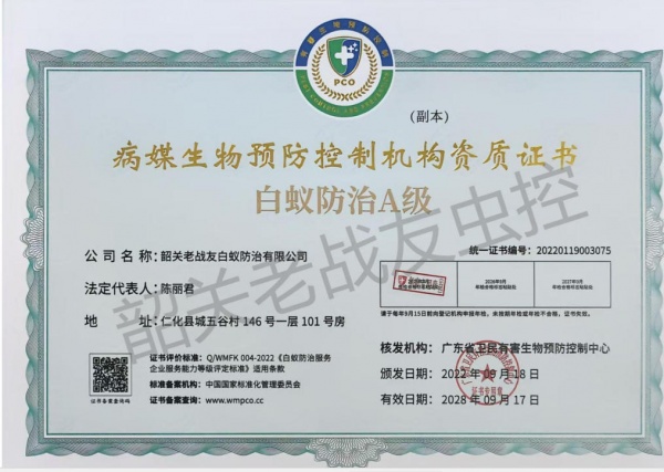 病媒生物预防控制机构资质证书虫控白蚁防治A级证书