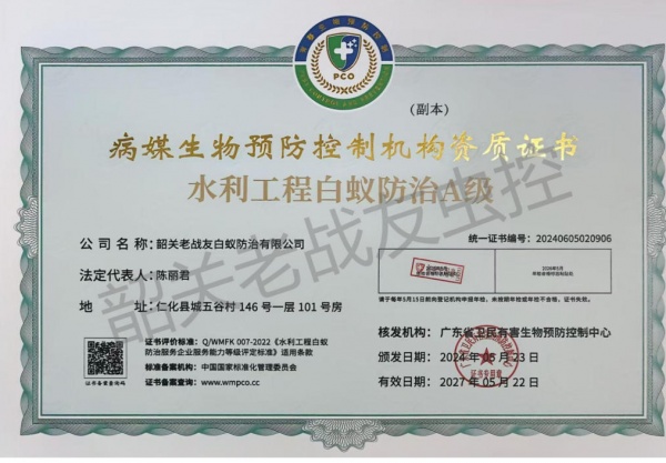 病媒生物预防控制机构资质证书水利工程白蚁防治A级证书